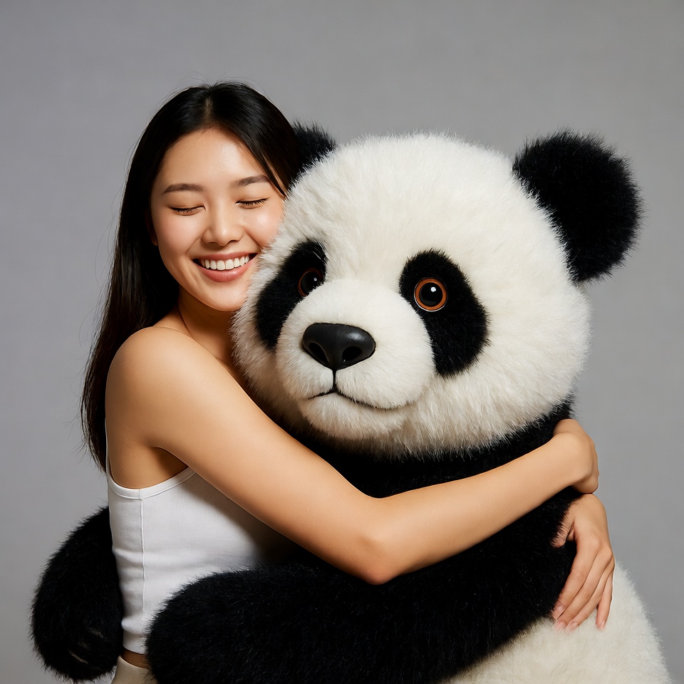 Asian woman hugging giant panda plush