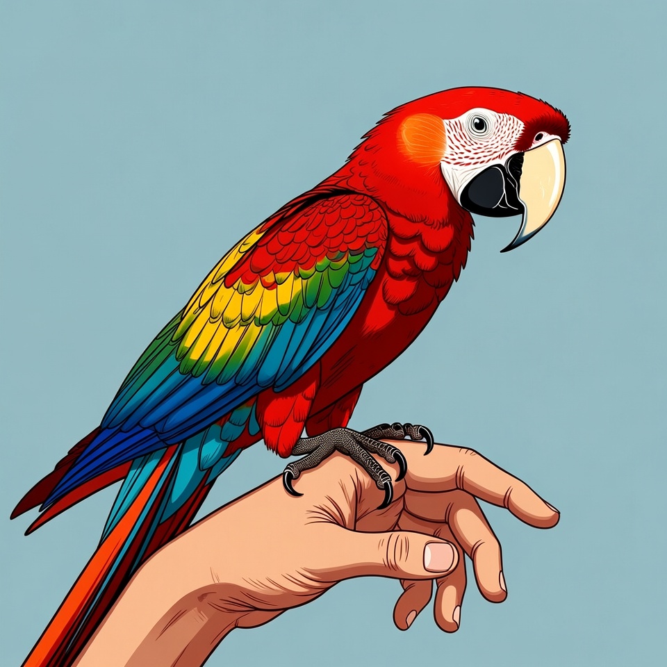 A vibrant red macaw parrot with blue and yellow wing feathers perches on a human hand. The parrot features a white facial patch, black beak, and detailed feathers in a colorful illustration style. The hand grips the parrot's talons against a light blue background.