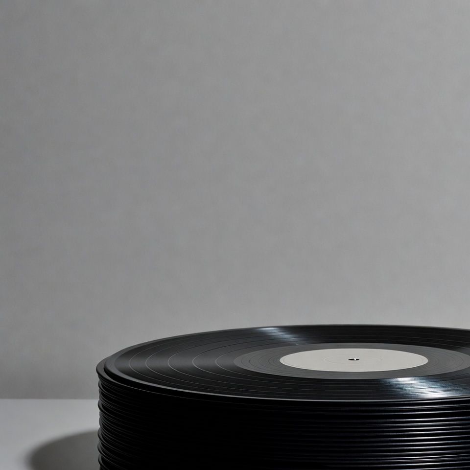 A tall stack of black vinyl records sits on a white surface against a light gray background. The records feature a shiny black exterior with a white label in the center of the top one. Soft shadows fall to the right of the stack.