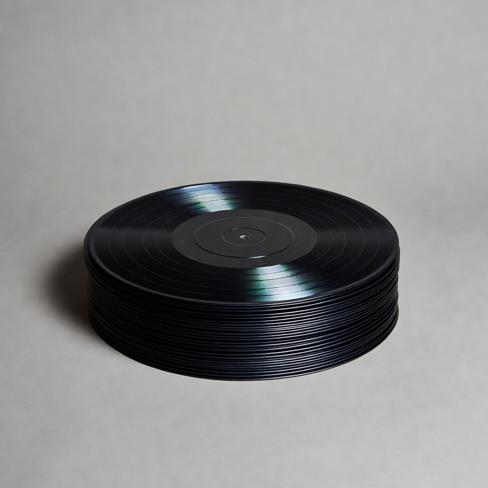 A tall stack of black vinyl records sits on a plain gray background. The records feature a shiny black surface with a central label and subtle green sheen on the edges. The stack is viewed from a low angle, emphasizing its height and circular shape.
