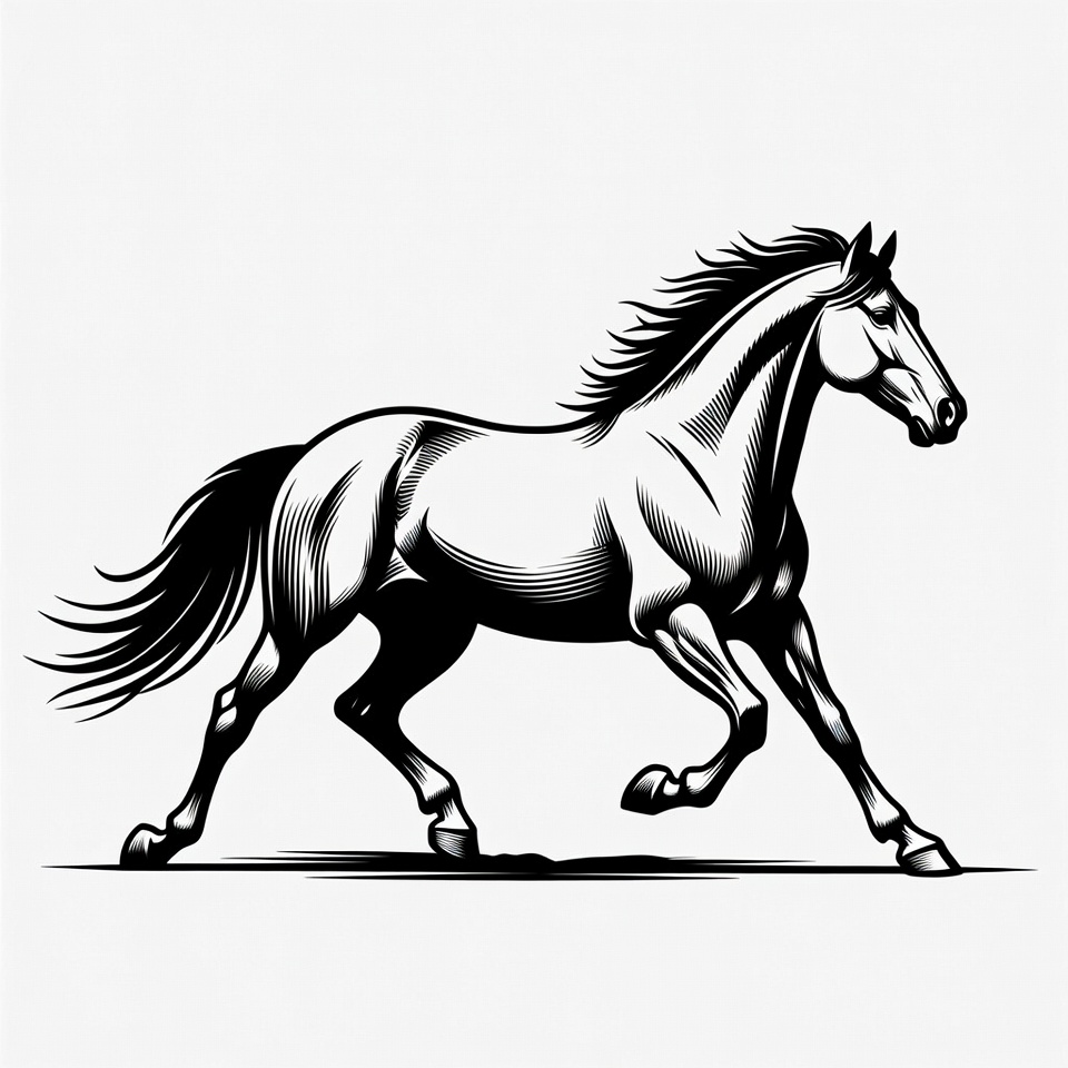 animal, black and white, clipart, dynamic pose, equine, galloping horse, horse illustration, ink drawing, isolated background, line art, mane, profile view, running horse, silhouette, stallion, tail, vector art, horse