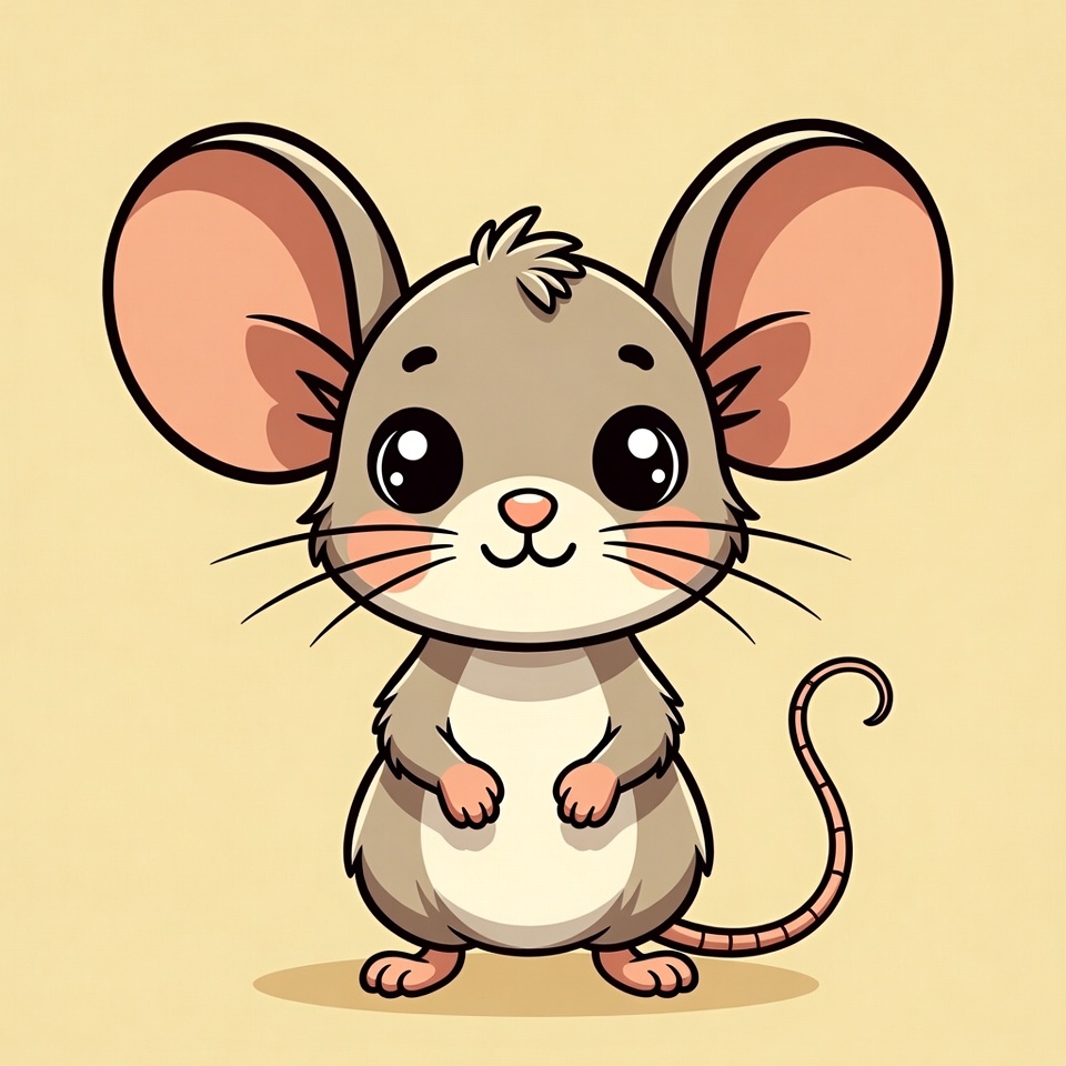 A kawaii-style cartoon mouse with large pink ears, big sparkling eyes, and a cheerful smile stands on a beige background. The mouse has light brown fur with a white belly, tiny paws, and a curly tail. It is illustrated in a vibrant, child-friendly vector art style.