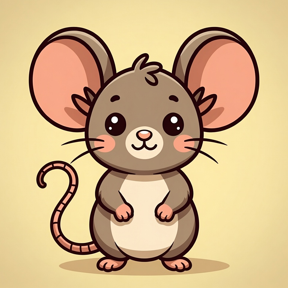 A kawaii-style cartoon mouse stands on a plain beige background. The mouse has large pink ears, big sparkling eyes, a small pink nose, and a cheerful smile. It features brown fur, a white belly, tiny pink paws, and a long curly tail.