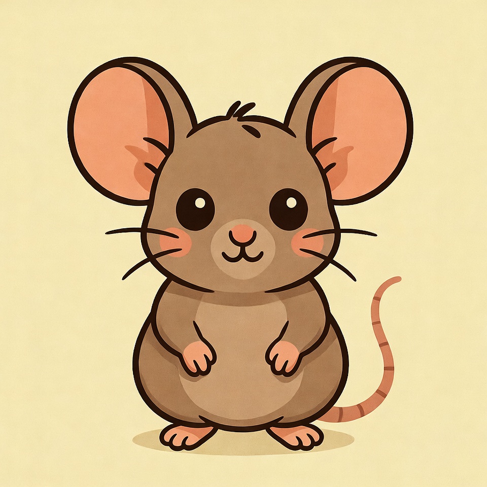 A cute cartoon mouse with large ears, big sparkling eyes, and a smiling mouth stands on a plain beige background. The mouse has brown fur, pink inner ears, a long tail, and small paws. It is illustrated in a kawaii style with soft outlines.