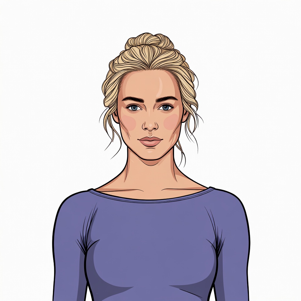 White, avatar, blonde hair, blue top, boat neck, bun hairstyle, cartoon, female, illustration, isolated background, long sleeves, portrait, pretty woman, smiling, young woman, woman