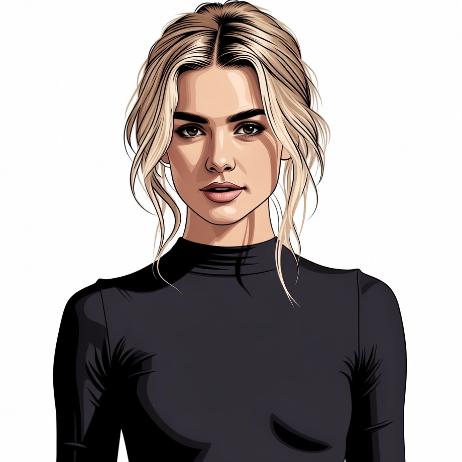 White, black turtleneck, blonde hair, closeup, digital illustration, face, female, high neck top, illustration, portrait, stylish hair, vector art, wavy hair, young woman, woman