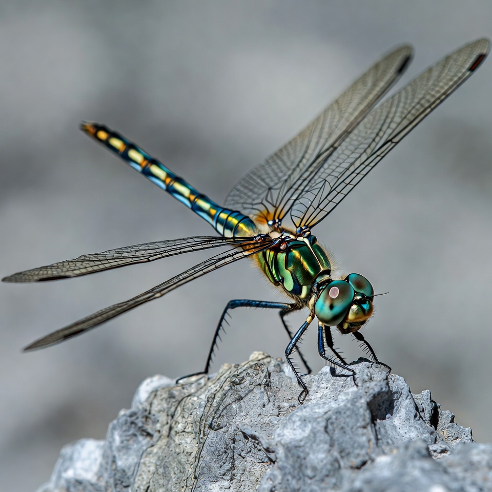 blue dragonfly, blue stripes, compound eyes, gray rock, green dragonfly, insect, iridescent wings, isolated background, macro photography, metallic green, nature, perching, rock, slender body, translucent wings, wildlife, wings, yellow tail, dragonfly