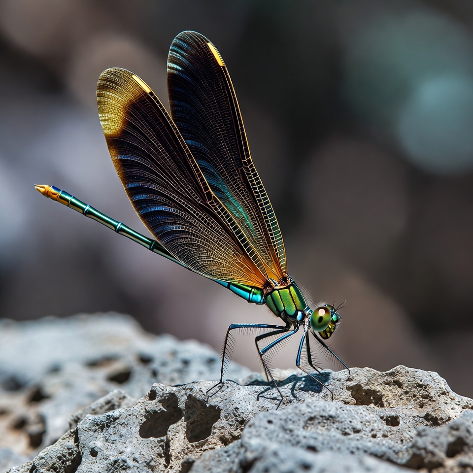 arthropod, blue wings, bokeh background, closeup, colorful, damselfly-like, detailed wings, green dragonfly, insect, iridescent, macro, metallic, nature, orange wings, perched, rock, slender body, vibrant colors, wildlife, wings, dragonfly