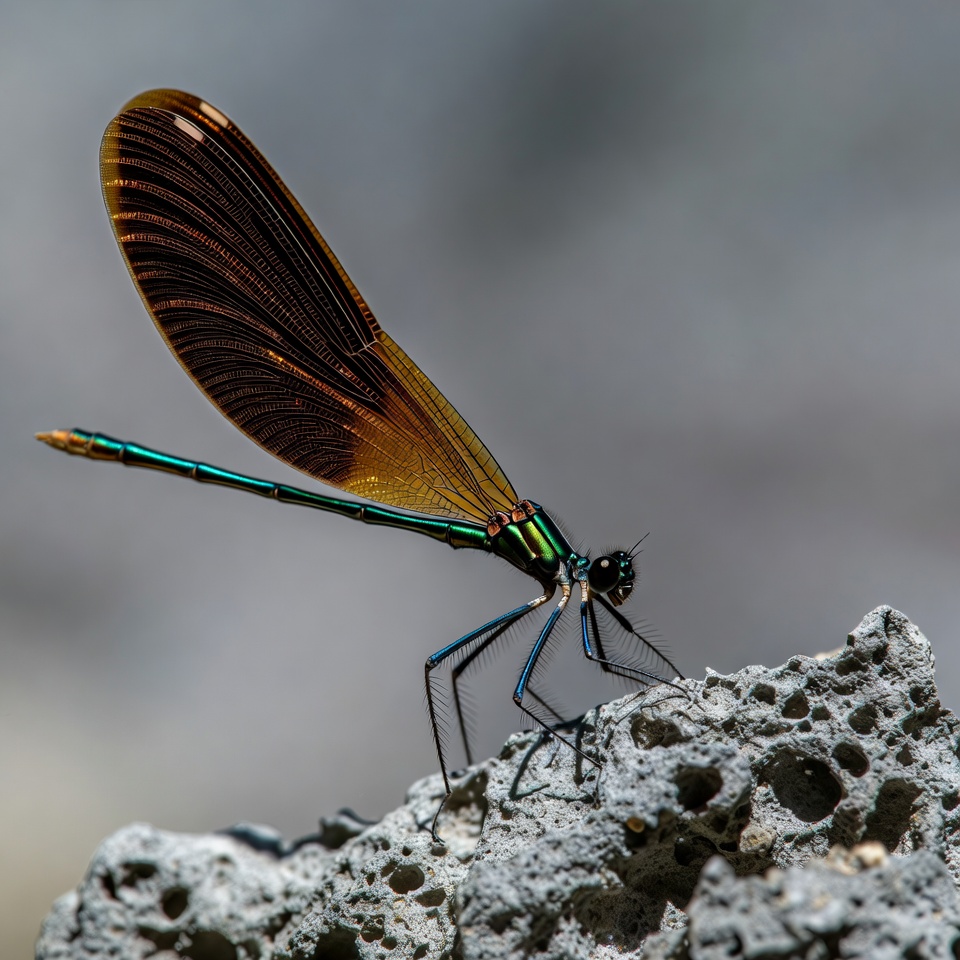 brown wings, colorful wings, compound eyes, dragonfly, green body, insect, iridescent, isolated background, macro, nature, orange wings, perched, rock, slender legs, wildlife, damselfly