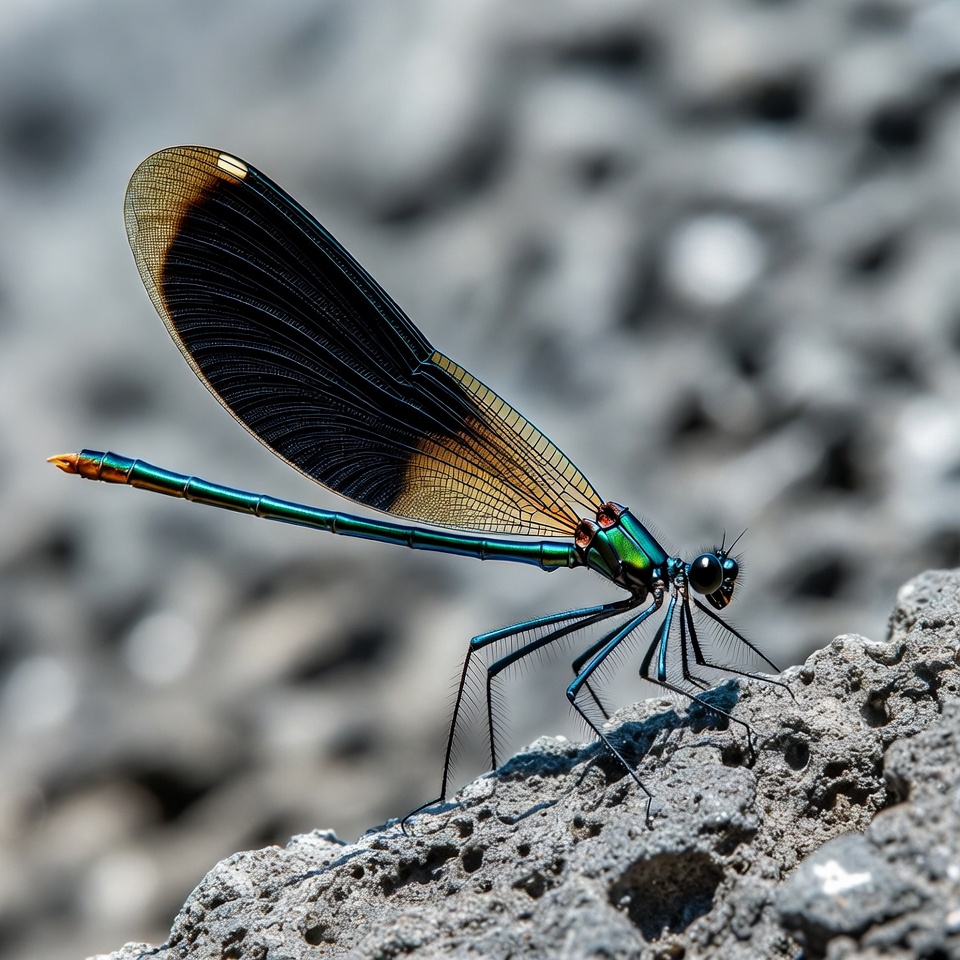 amber wings, arthropod, black wings, closeup, gray rock, green dragonfly, insect, long legs, macro, metallic green, nature, outdoor, perched, rock, translucent wings, wildlife, wings, dragonfly