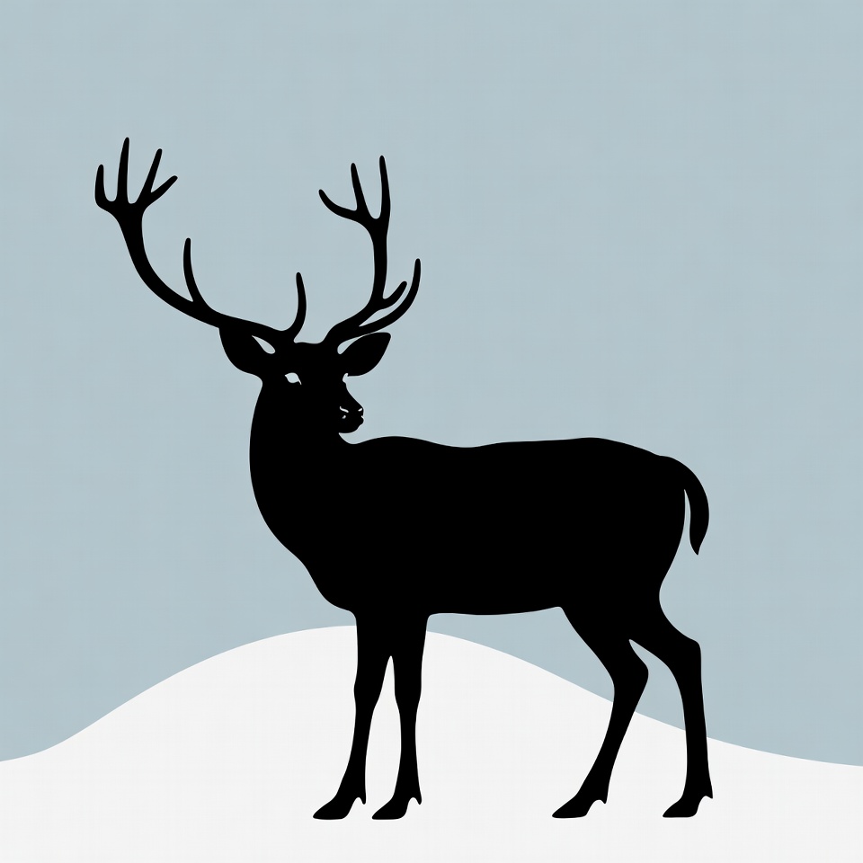 A black silhouette of a majestic deer with large antlers stands on a snowy mound. The deer faces forward against a light blue background. The image features a simple, isolated design.