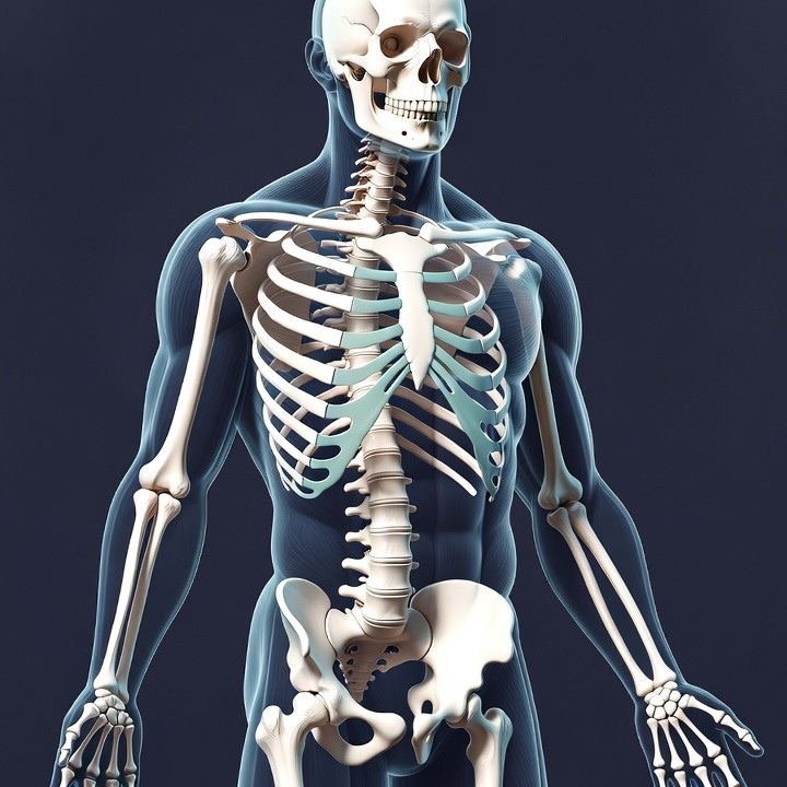 3D skeleton, anatomical model, anatomy, arms, bones, cyan highlights, dark background, full body, isolated background, legs, male skeleton, medical illustration, pelvis, ribcage, skeletal system, skull, spine, standing pose, white bones, human skeleton