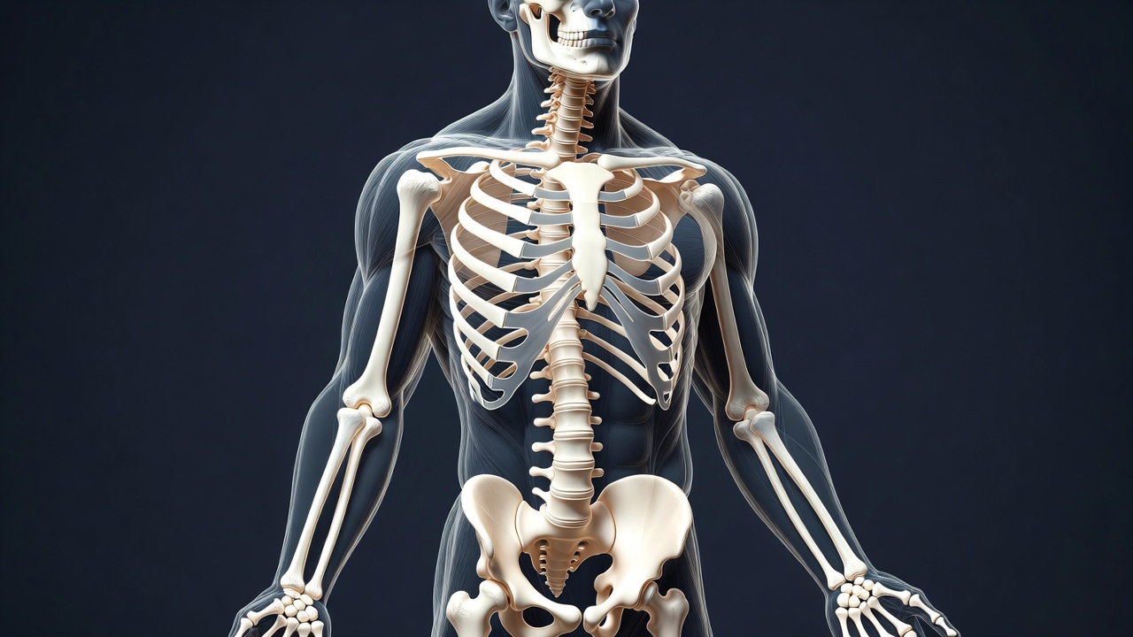 A detailed 3D illustration of a male human skeleton stands against a dark background. The skeleton features a realistic bone structure with visible ribs, spine, arms, and legs. It is rendered in white bones with subtle muscular overlays in blue.