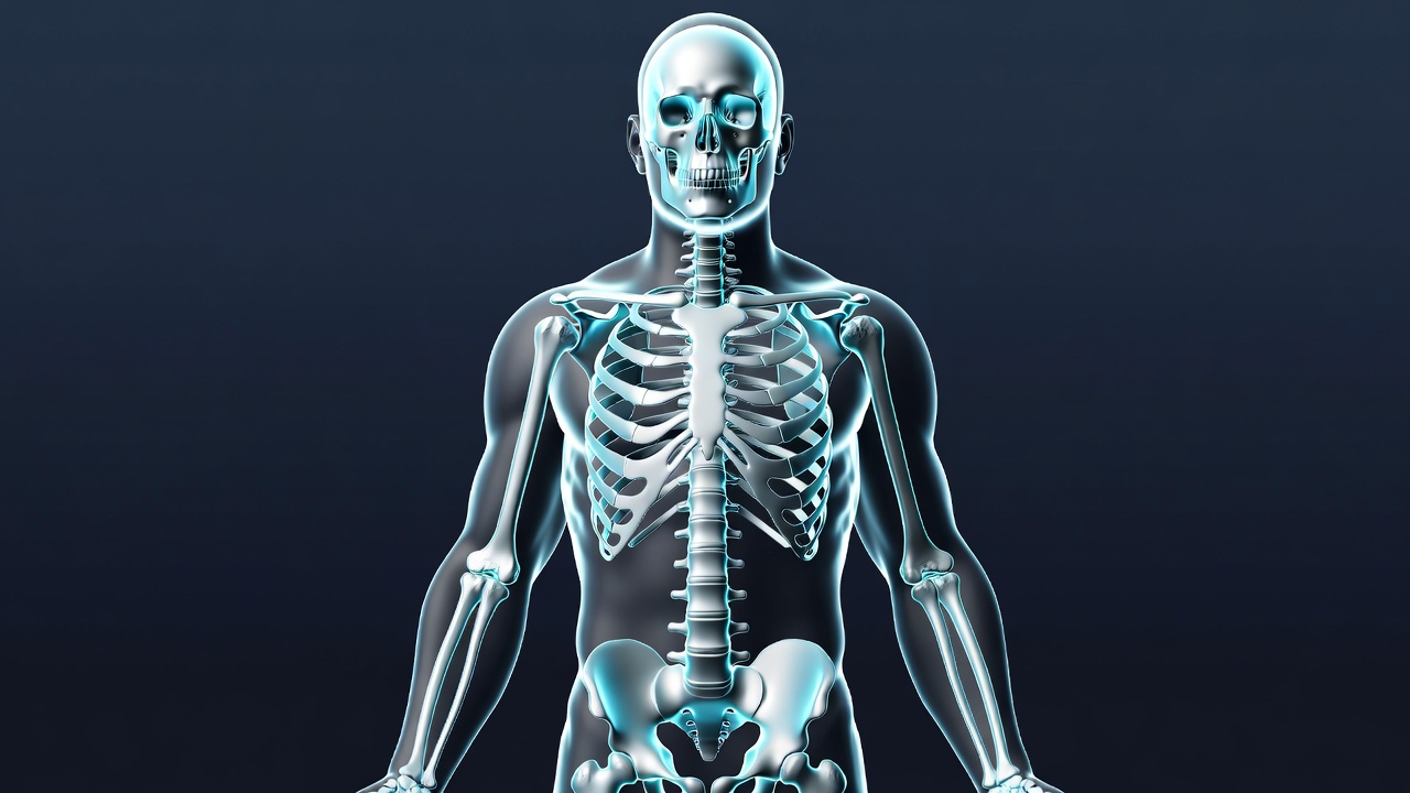 A detailed 3D rendered human skeleton stands frontally against a dark background. The bones glow with a cyan blue hue, highlighting the skull, ribcage, spine, arms, and pelvis. The figure is posed with arms slightly outstretched in a neutral stance.