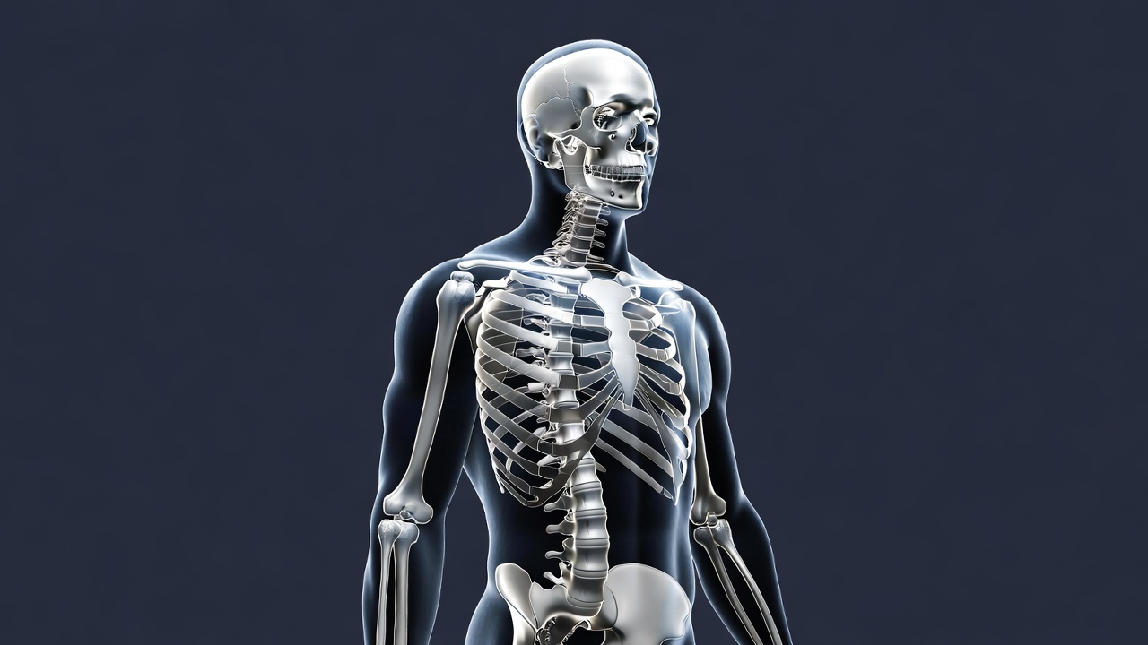 3D skeleton, anatomy, arms, bones, dark background, digital render, front view, isolated background, legs, medical illustration, pelvis, ribs, silver bones, skull, spine, human skeleton