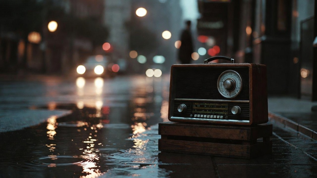 Vintage radio on wet street