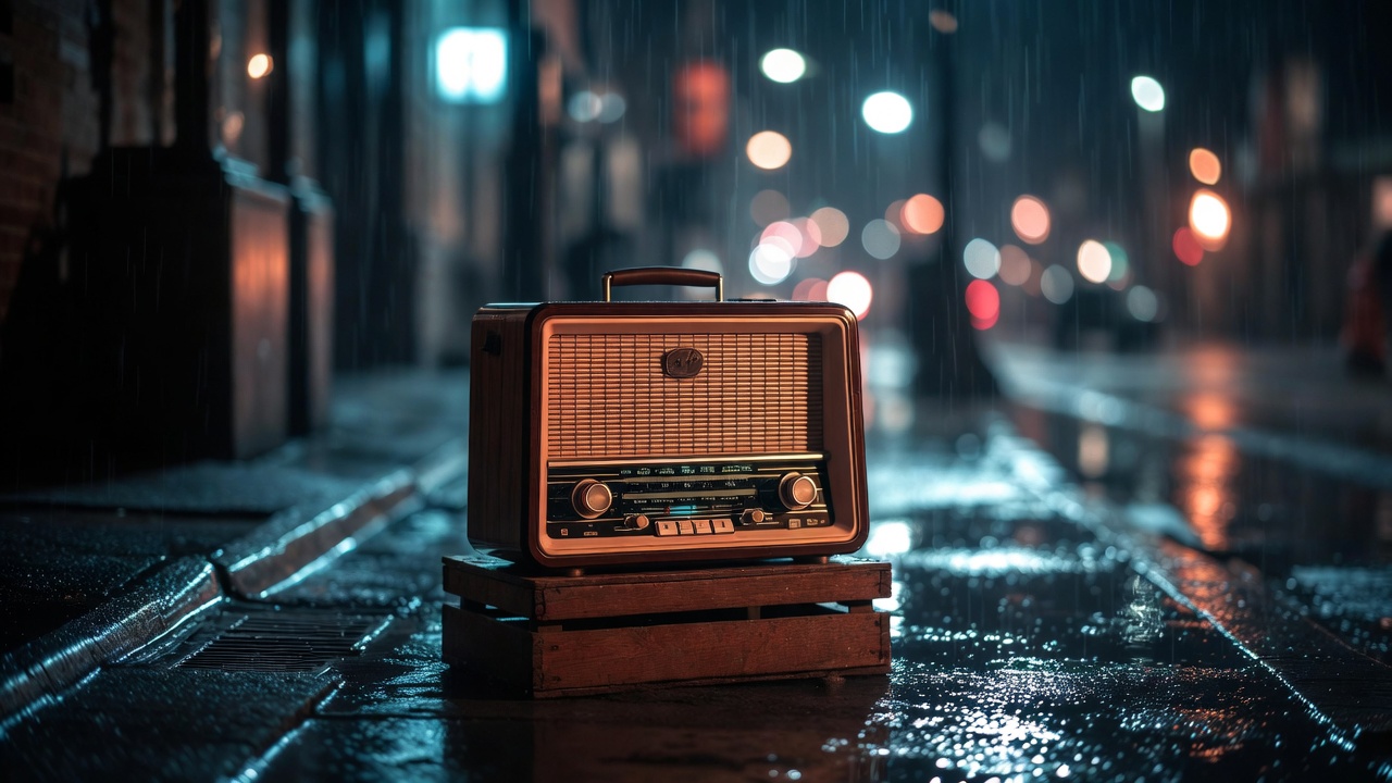 A wooden vintage portable radio sits on a wooden platform on a wet urban street at night. Rain covers the pavement, reflecting neon lights and blurred city lights in the background. The scene features a dark, rainy atmosphere with glowing street lamps.