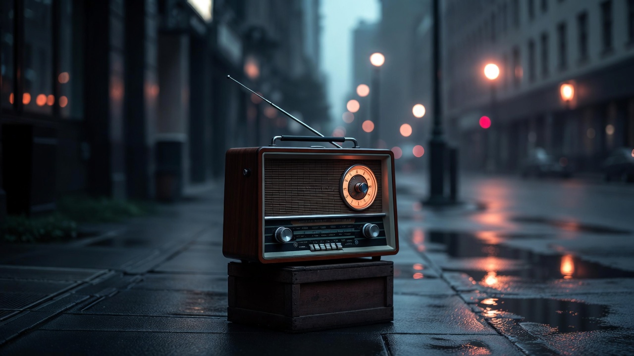 A wooden vintage radio with glowing orange dial sits on a wooden crate on a wet urban street at night. The background features blurred city lights, street lamps, and reflections on the pavement after rain. An antenna extends from the top of the radio.