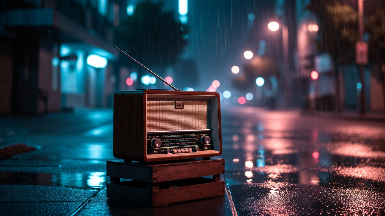 Vintage Radio in Rainy Neon Street
