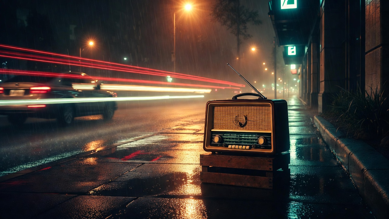 antenna, blurred cars, car light trails, city night, dark atmosphere, evening rain, light streaks, neon sign, night scene, old radio, puddles, rainy night, reflections, retro radio, sidewalk, street lamp, suitcase radio, urban street, wet street, vintage radio
