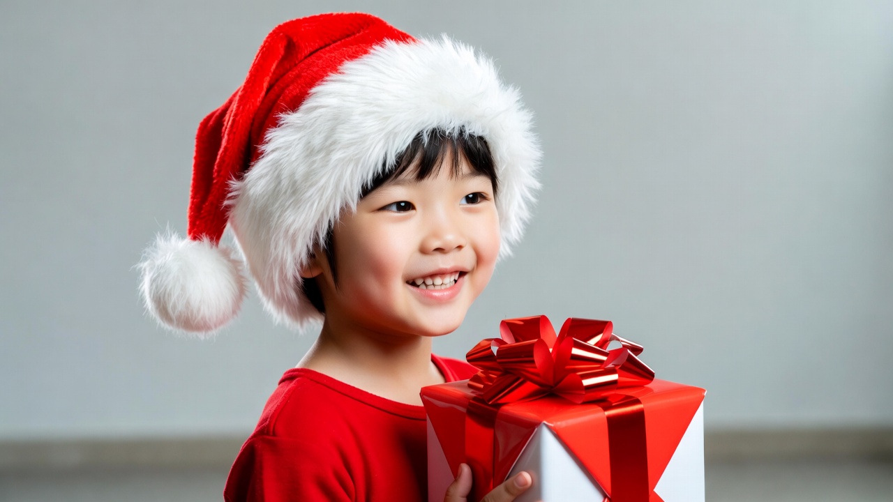 A young Asian boy with short black hair wears a red Santa hat with white fur trim and a red shirt. He smiles happily while holding a large white gift box wrapped with a red ribbon and bow. The boy stands against a plain gray background.