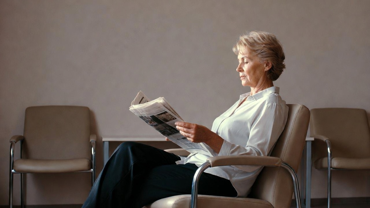 An elderly White woman with short gray hair sits in a beige armchair in a waiting room, reading a newspaper intently. She wears a white blouse and black pants, with her legs crossed. Empty chairs are positioned nearby on a neutral background.