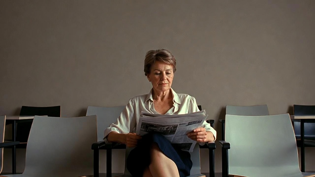 A mature woman with short gray hair sits in a gray chair reading a newspaper. She wears a white blouse and dark skirt, with her legs crossed. Several empty gray chairs are arranged in a row on a plain gray background.