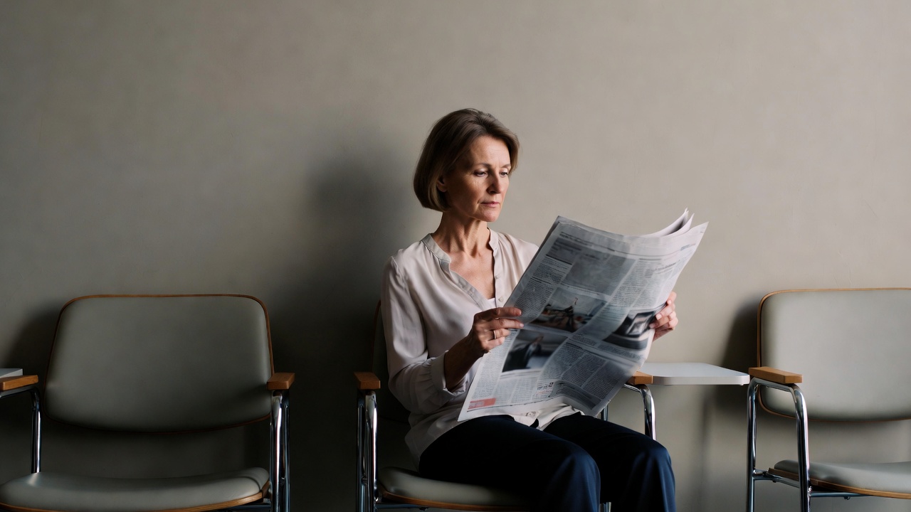 A middle-aged White woman with short brown hair sits on a gray chair in a waiting area, intently reading a newspaper. She wears a white blouse and dark pants, with her legs crossed. Empty chairs line the neutral gray wall behind her.