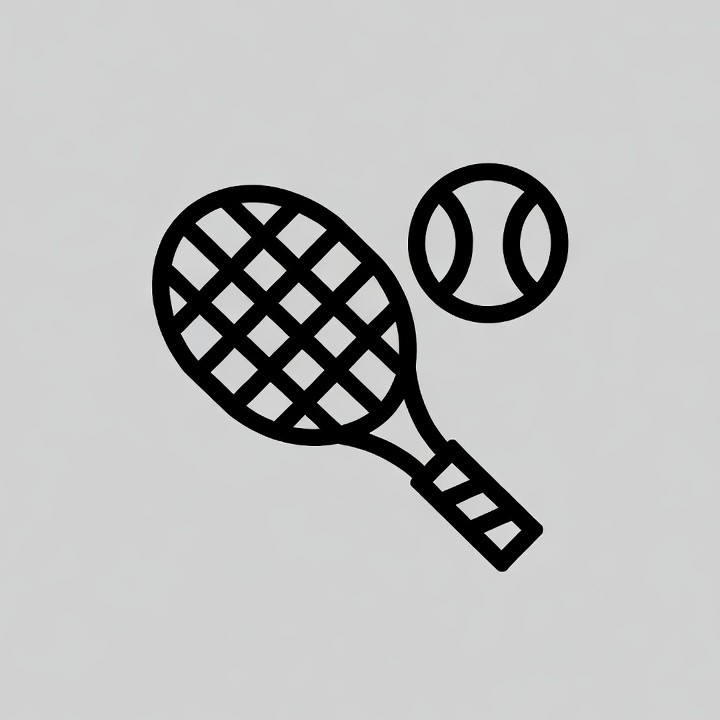 A black line art illustration of a tennis racket with a strung head and grip handle stands beside a tennis ball. Both are depicted in a simple outline style on a light gray background. The design is clean and isolated for easy use.