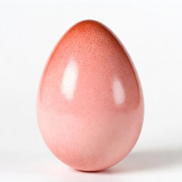 A glossy pink egg with reddish speckles sits on a white background. The egg has a smooth, shiny surface with subtle texture variations. It is centered and isolated against the plain backdrop.