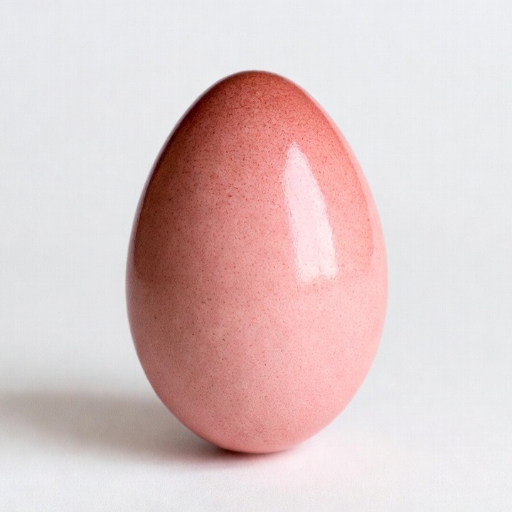 A single pink egg with a glossy, shiny surface sits isolated on a white background. The egg has a smooth, rounded shape with subtle light reflections highlighting its ceramic-like texture.