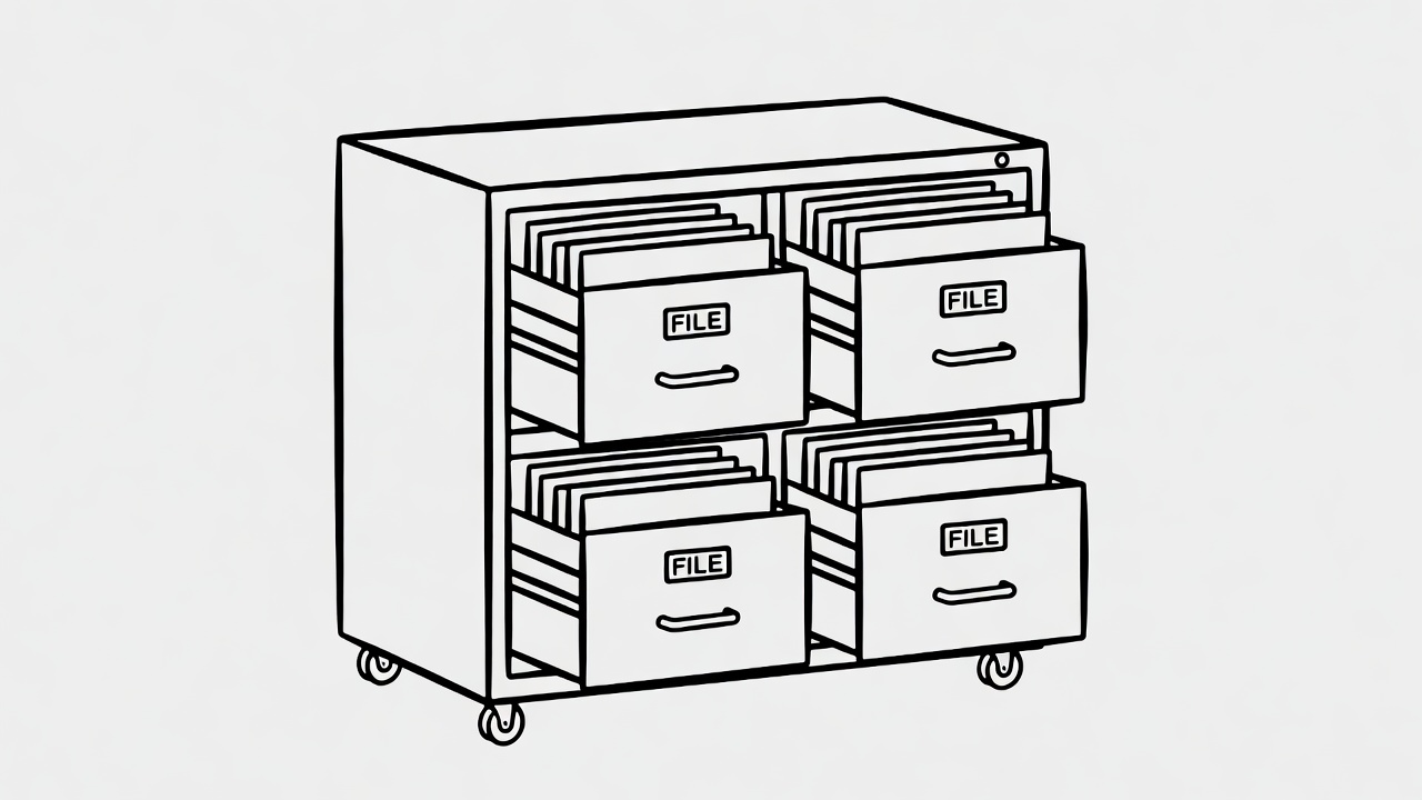 black outline, clipart, drawers open, file folders, filing cabinet, four drawer, illustration, isolated background, labeled files, line drawing, metal cabinet, office furniture, office storage, vector art, wheels, file cabinet