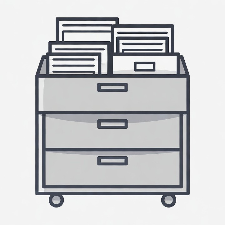 A simple line art illustration of a gray three-drawer file cabinet on wheels. The top two drawers are pulled open and overflowing with stacked white papers and folders. It features a clean, minimalist design on an isolated white background.