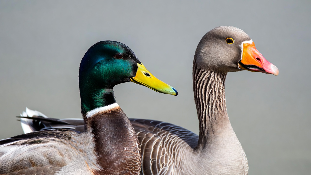 A male mallard duck with green head, yellow bill, and white neck feathers stands beside a gray Egyptian goose with orange bill. Both birds face forward with necks extended against a blurred gray background. Their detailed feathers and profiles are sharply captured.