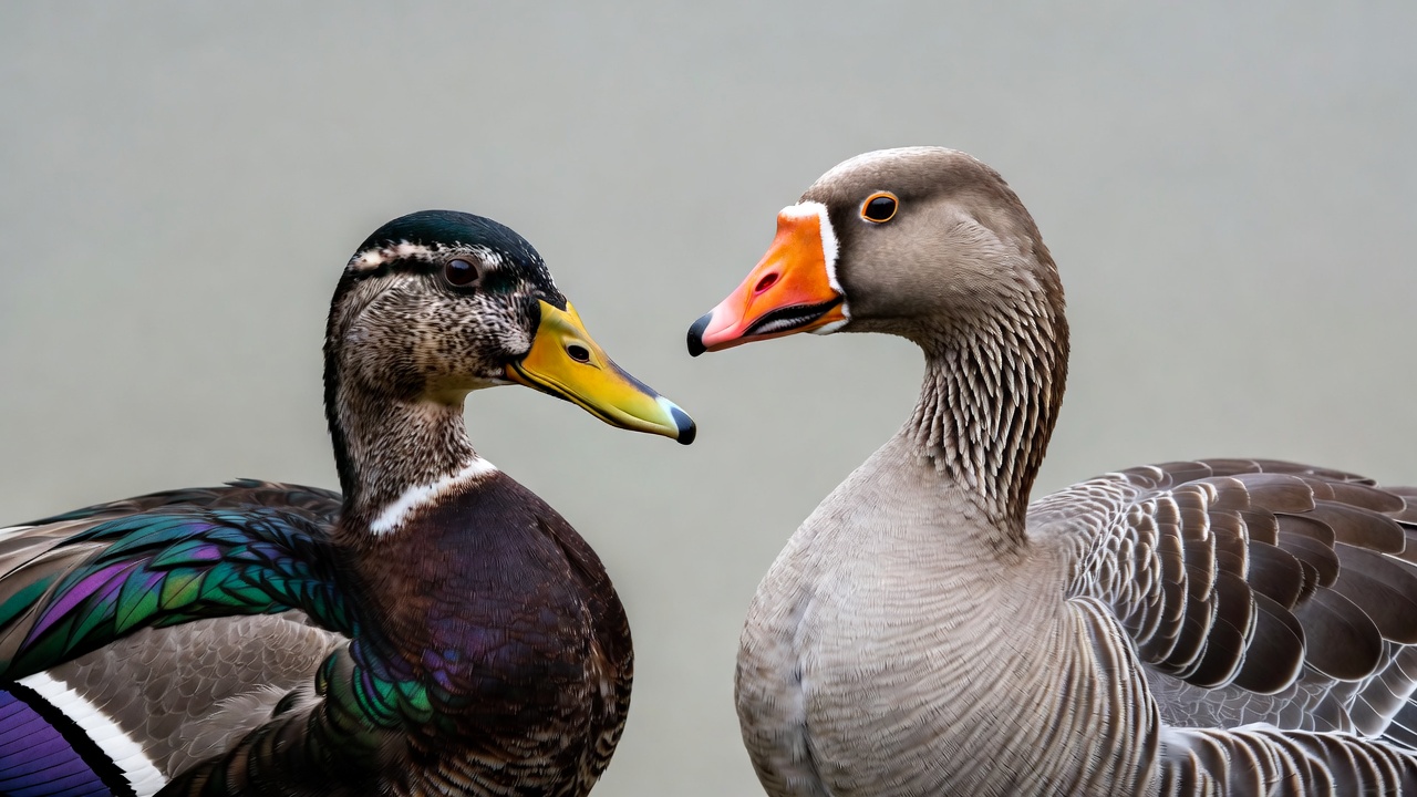 A male mallard duck with iridescent green head, purple-blue wing feathers, and yellow bill faces a gray goose with orange bill on a plain gray background. Both waterfowl are in close profile view, looking at each other intently. Their feathers show detailed textures and vibrant colors.