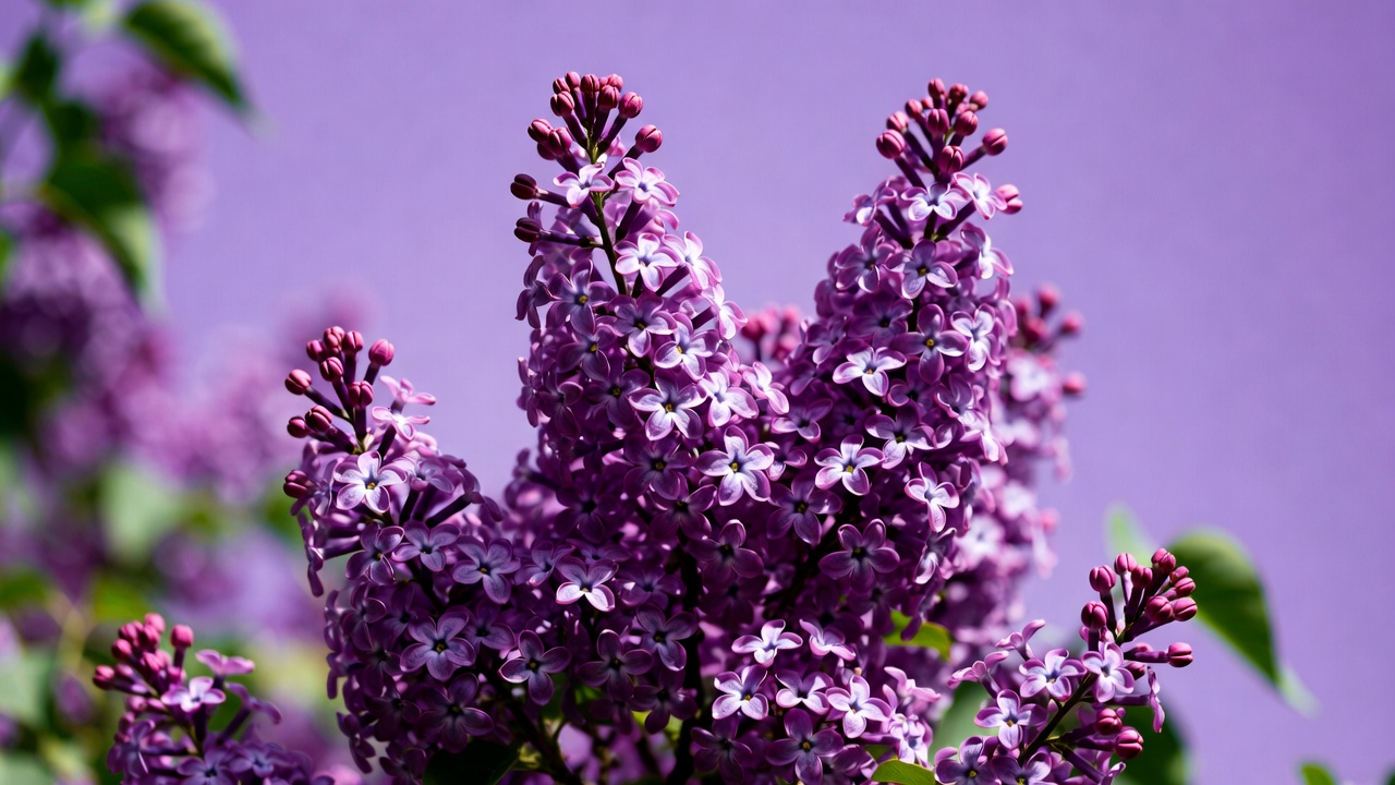 A close-up view of vibrant purple lilac flowers in full bloom. The blossoms form dense clusters with tiny florets and green leaves. The image features a soft purple background highlighting the flowers.