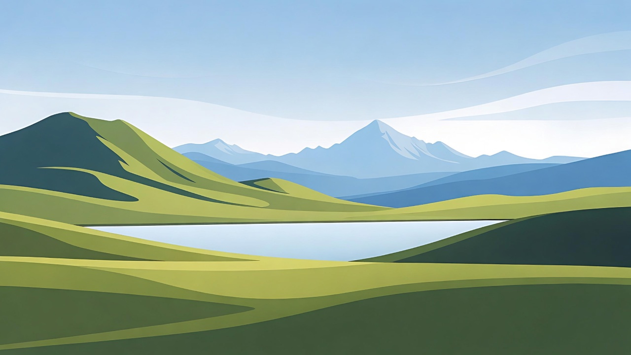 A minimalist vector illustration depicts a serene landscape with snow-capped mountains in the background. A calm lake reflects the surrounding green hills and grassy fields under a clear blue sky. The artwork features smooth, flat colors and simple geometric shapes.