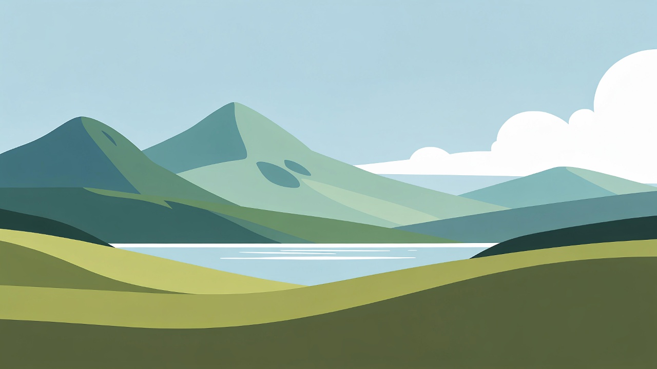 A minimalist vector illustration features layered green mountains with sharp peaks under a light blue sky with white clouds. A serene lake reflects the surrounding green hills and grassy fields in the foreground. The artwork uses flat colors and simple shapes on an isolated background.
