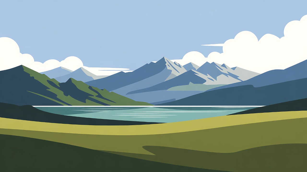 A vibrant vector illustration depicts a serene lake surrounded by snow-capped mountains under a blue sky with fluffy white clouds. Lush green meadows frame the foreground, leading to the deep blue water. The artwork uses bold, flat colors in a minimalist style.