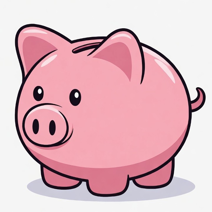 big eyes, black outline, cartoon pig, clipart, curly tail, cute animal, financial illustration, glossy pig, illustration, isolated background, money saver, pink piggy bank, savings pig, snout, piggy bank