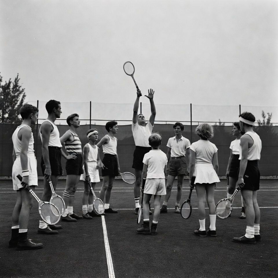 A black and white photograph shows a male tennis coach raising a tennis racket high while standing in the center of a circle of young boys and girls on a tennis court. The children, dressed in 1950s-style tennis uniforms including shorts, skirts, tank tops, and headbands, hold their own rackets and look up attentively. A chain-link fence and trees are visible in the background.