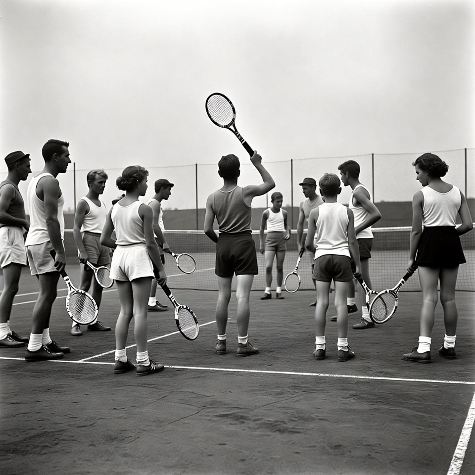 A black and white photograph shows a male tennis coach holding a racket high while instructing a group of young male and female players on a tennis court. The players, dressed in white tank tops, shorts, and skirts, stand in a circle around the coach, each holding tennis rackets. They are positioned on an outdoor court with a chain-link fence in the background.