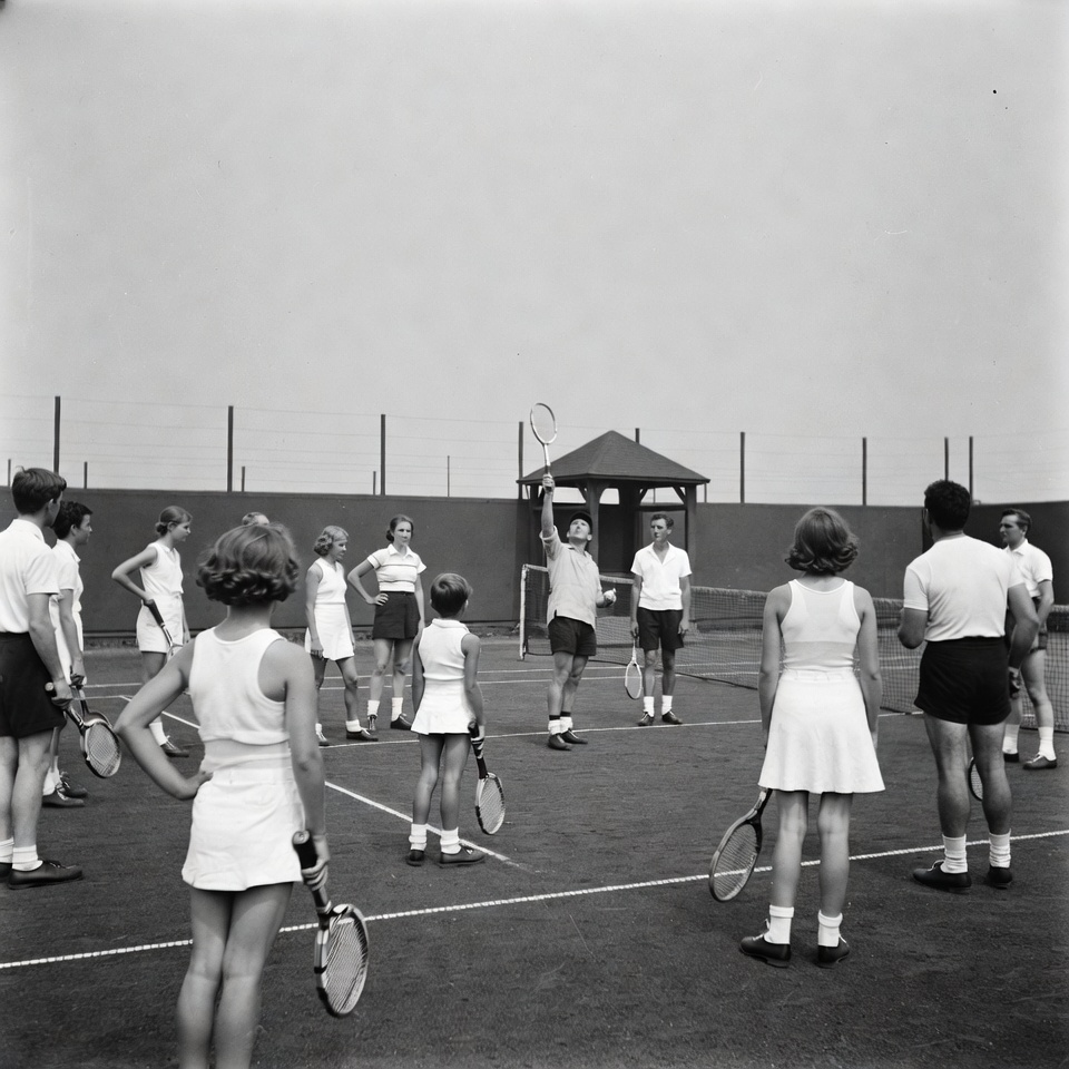 White, black and white, boys, children, clay court, coach, dresses, fence, girls, group, men, outdoor, pavilion, playing tennis, rackets, shorts, sport, tennis court, tennis lesson, vintage, tennis