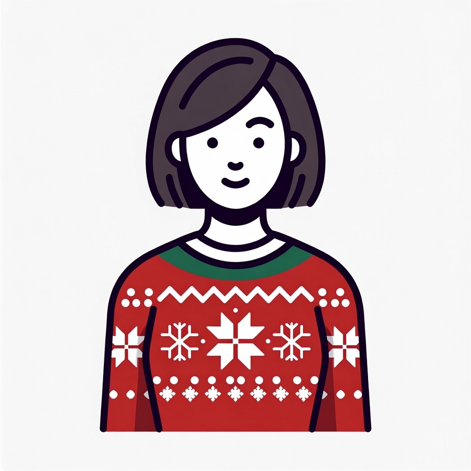 A line art illustration of a smiling woman with short dark hair and bangs. She wears a festive red Christmas sweater adorned with white snowflake patterns and green collar trim. The vector graphic is isolated on a white background.