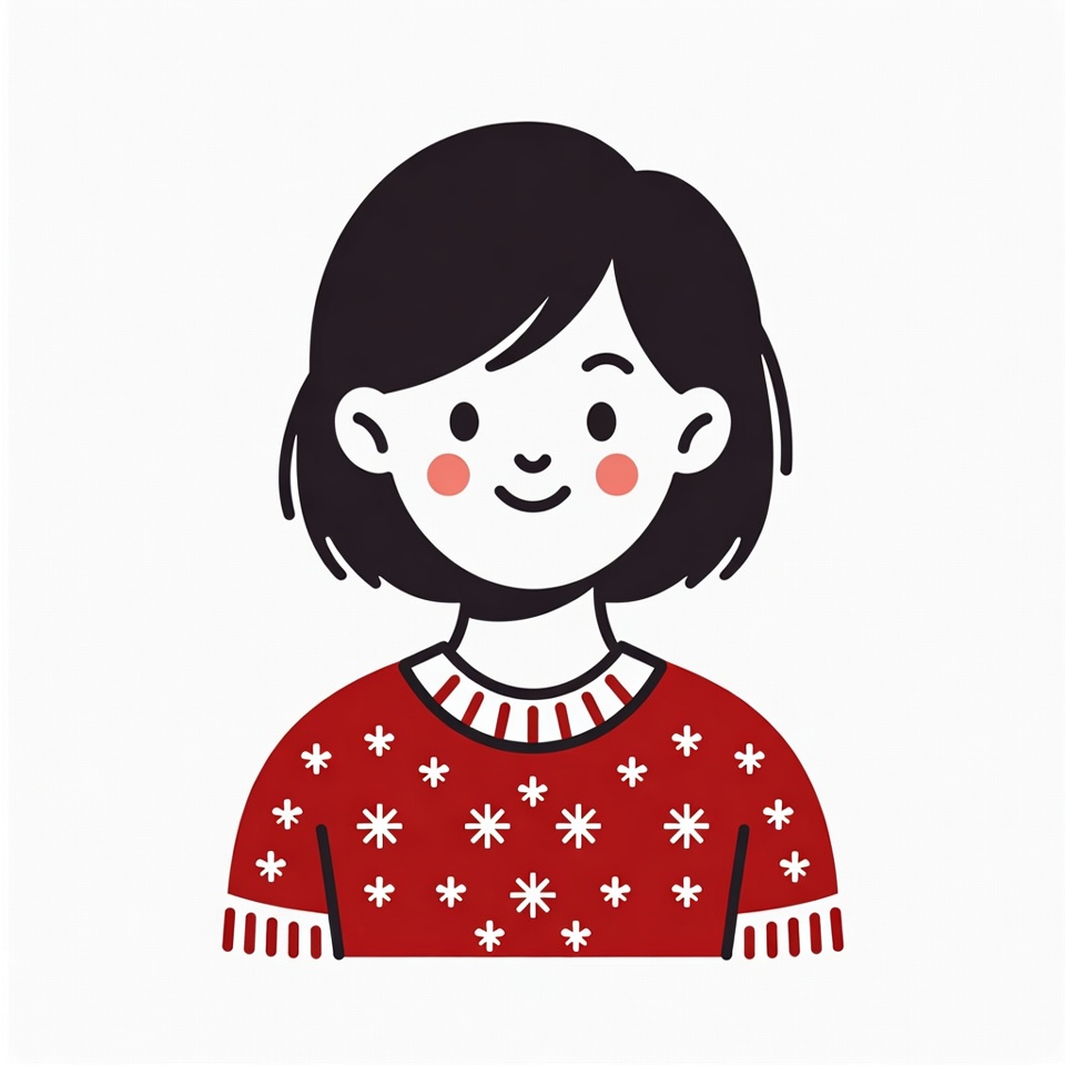 A cute cartoon illustration of a young girl with short black hair and rosy cheeks smiles happily. She wears a vibrant red sweater adorned with white snowflake patterns and fringed edges. The image features a simple isolated white background.