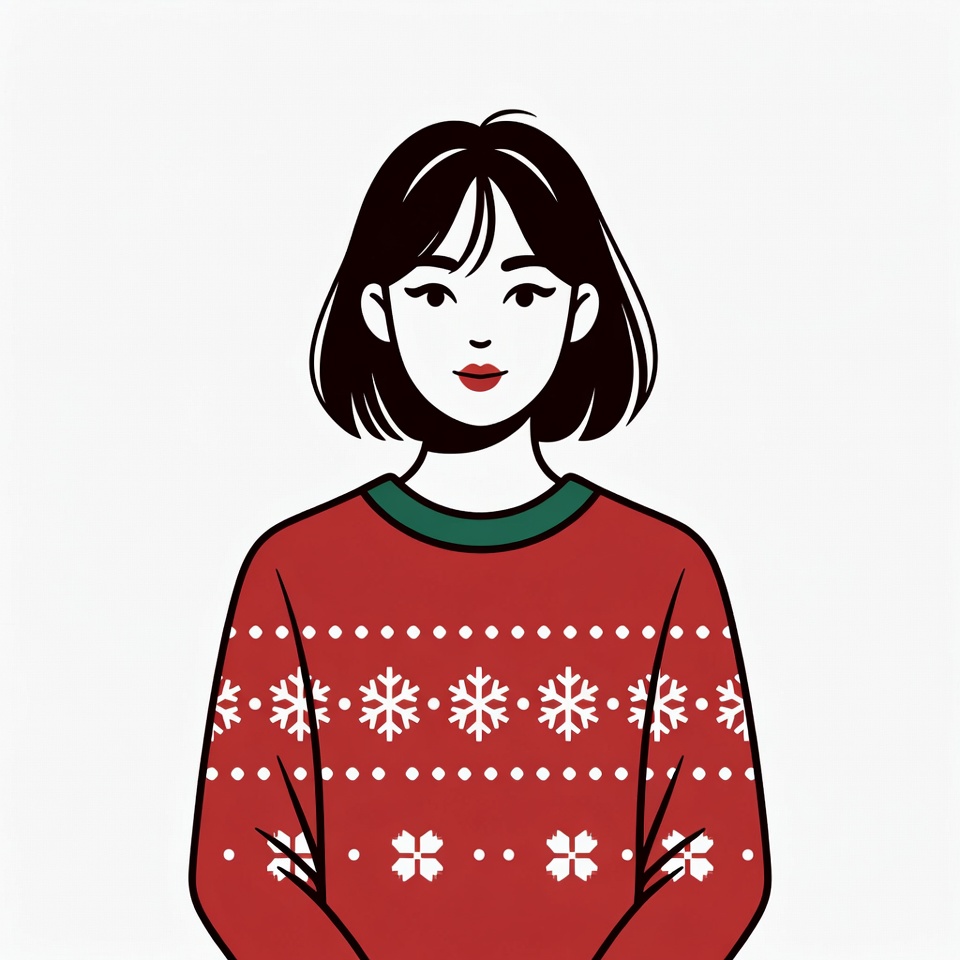 An illustration of a young Asian woman with short black hair and red lips stands smiling against a white background. She wears a vibrant red Christmas sweater adorned with white snowflake patterns and a green collar. Her hands are clasped in front of her.