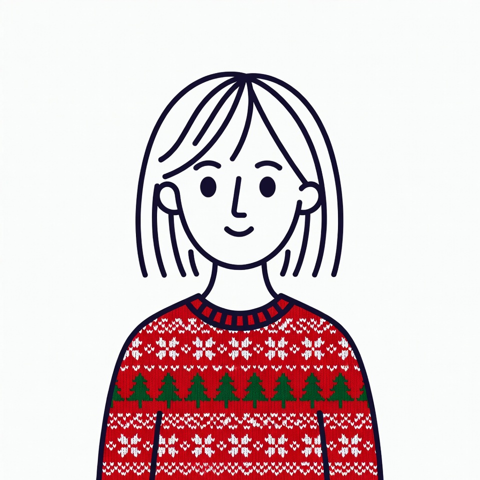 A line art illustration depicts a smiling woman with straight blonde hair wearing a festive red sweater adorned with white snowflakes and green Christmas trees. She faces forward on an isolated white background. The drawing features bold black outlines and simple facial features.