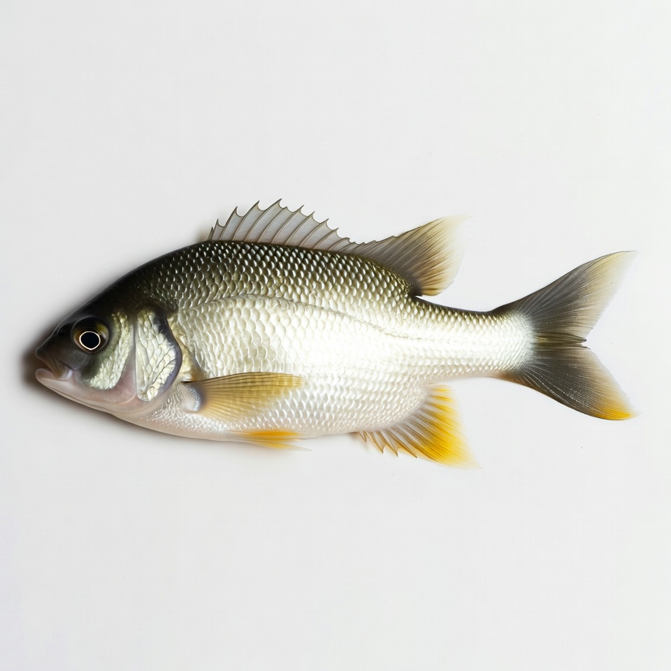 A fresh sea bream fish with a dark head and silvery body lies on a white background. It features black eyes, a protruding lower jaw, and yellow-tinted fins. The scales glisten under the light.