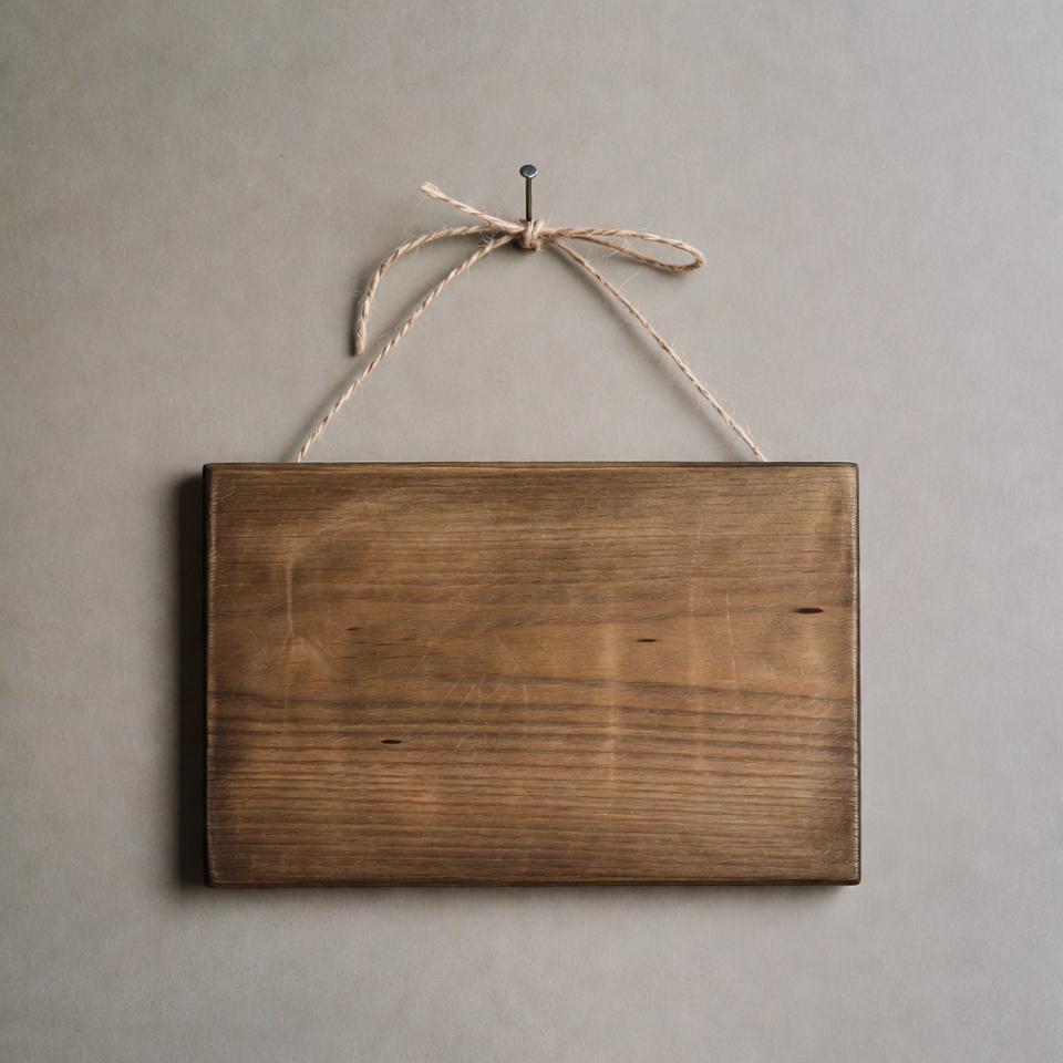 A rectangular blank wooden sign with natural wood grain hangs from beige twine on a light gray background. The sign is suspended by a small nail and features smooth, unfinished wood surfaces. The twine is tied in a bow at the top.
