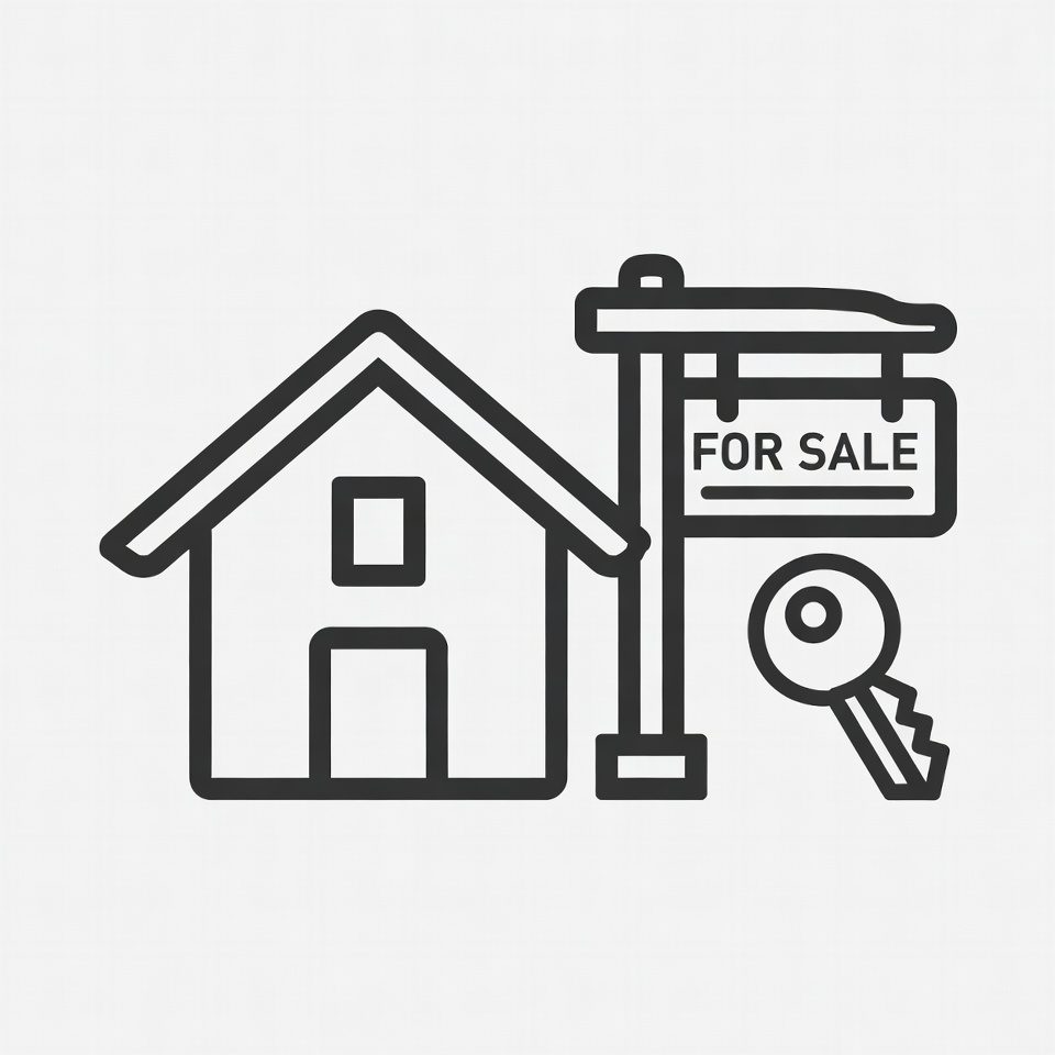 A simple black line art illustration shows a house next to a 'For Sale' sign on a post. A key hangs beside the sign. The image is isolated on a white background.
